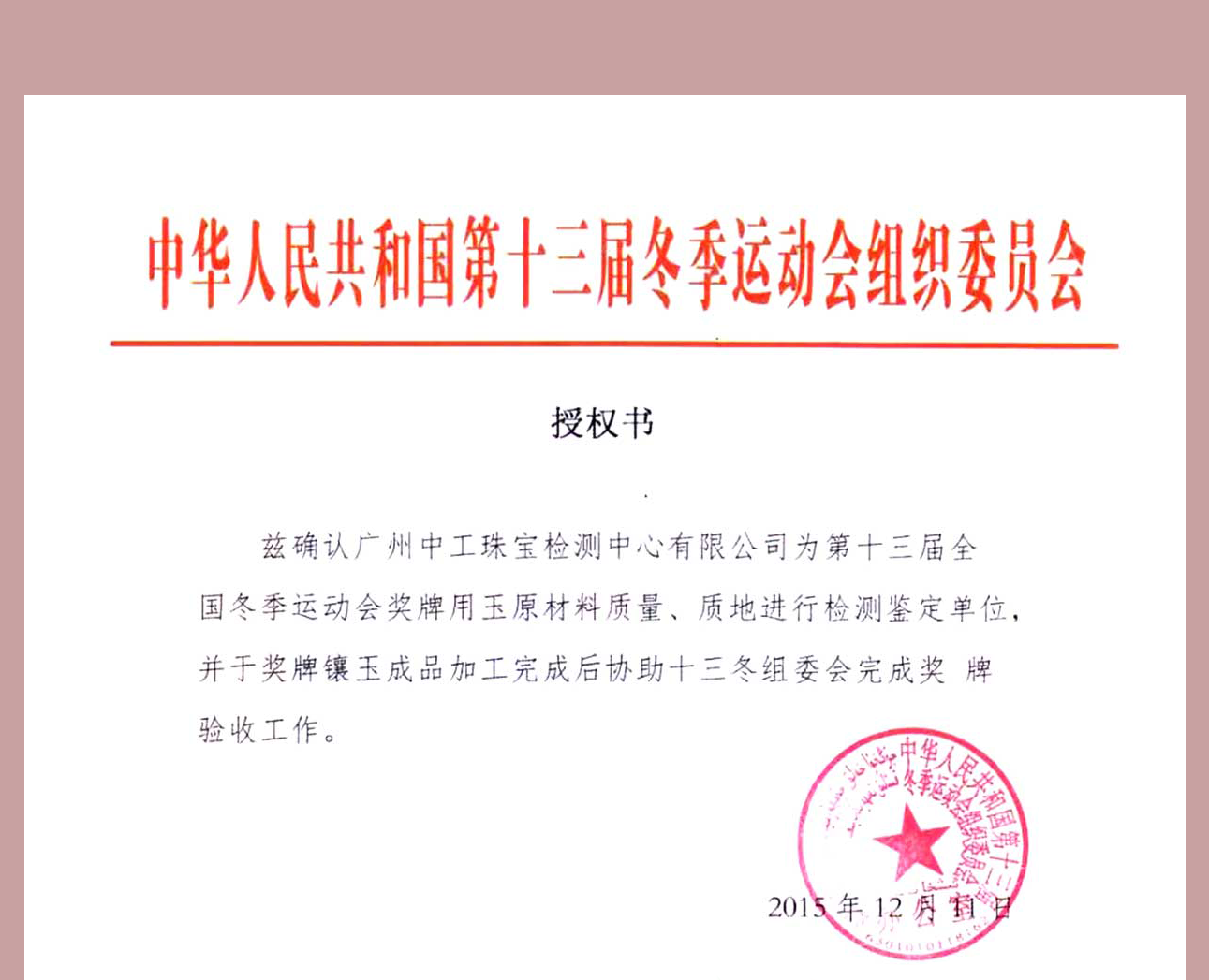 广州V体育受中华人民共和国第十三届冬季运动会组委会的授权委托对运动会奖牌用玉原料质量、质地、颜色进行检测鉴定...